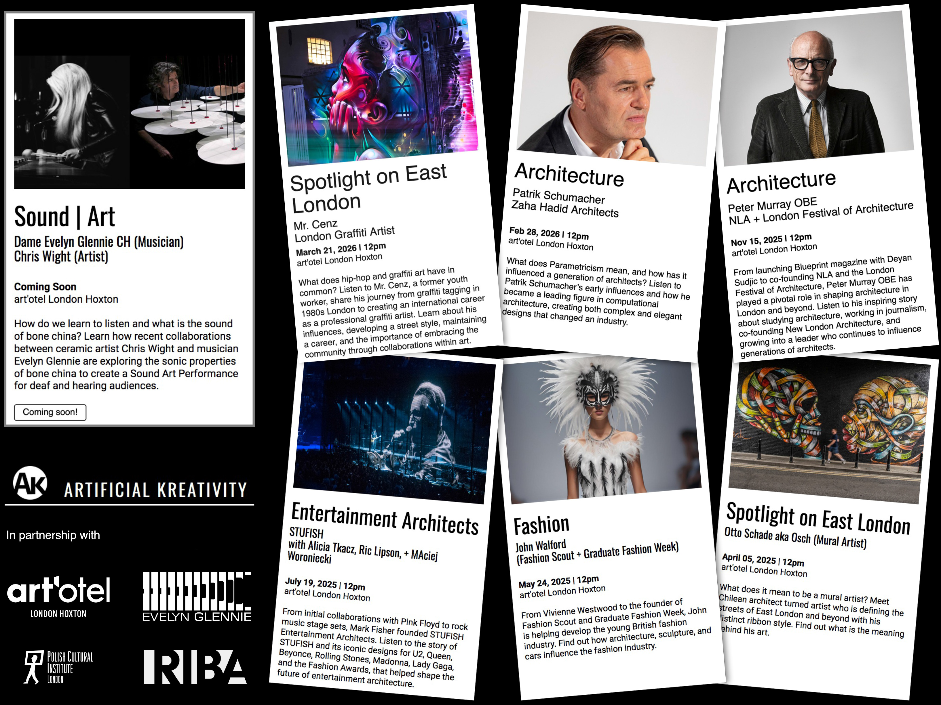 “Listen to the stories behind the creatives and how they are shaping the world. We take a closer look at each speaker’s career journey, exploring the choices they made and the experiences that defined them. This is an opportunity for students and early-year creative practitioners to learn about various professions, including art, architecture, music, and fashion, and how each approaches creativity differently. We are here to help break down the barriers in the creative industries and inspire the next generation of change.” Artificial Kreativity.